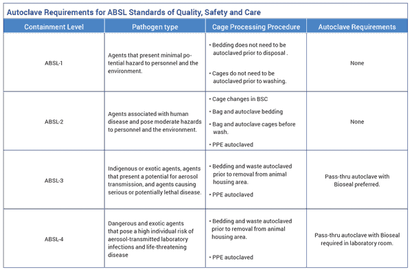Properly Sizing an Autoclave Chamber for Your Animal Lab Written by: Mike Peters Steam sterilization is routinely used in animal laboratories for two reasons: 1) to sterilize animal cages in order to create a pathogen-free housing environment and 2) to properly dispose of harmful waste products. Since autoclaves are essential for everyday laboratory operation, it is important to select a chamber size with enough capacity to meet the lab’s demand for cage and waste processing. Under-sizing the autoclave will leave it insufficient to meet the lab’s demands while an oversized autoclave takes up valuable lab space and carries a higher upfront cost. An animal lab facility should consider two primary factors before making a sterilizer purchasing decision: The facility’s Animal Biosafety Level requirement The number of animal cages that need to be processed What are my Animal Biosafety Level requirements? The ABSL rating of a particular animal lab can influence cage sterile processing procedure, which impacts throughput. For example, consider the process flows for two laboratories, one ABSL-1 and one ABSL-3, changing out the same amount of cages per week. Although both labs are processing the same amount of cages, the ABSL-3 laboratory has over twice the sterilization demand. In addition to autoclaving the fully assembled cages (the final step), an ABSL-3 lab must also perform two additional autoclave cycles: one for the cages before washing and one for the soiled bedding. It is important to note that after emptying the soiled cages in a biological safety cabinet (BSC), they can be nested together (see Figure 4) to allow more cages to fit in the autoclave chamber. After washing, the cages are sterilized fully assembled with bedding (see Figure 3). How many cages need to be processed? The first step in determining the required autoclave chamber size is figuring out how many cages are changed at a time. This estimation depends on the total number of animals in the facility and their size.[1] After you have established an estimate for how many cages need to be changed, consider that a standard mouse cage is approximately 7.5” x 11.5” x 5”. From here, you can approximate chamber dimensions to handle the amount of cages you need to sterilize per load. For example, 80-96 fully assembled mouse cages can comfortably fit in an autoclave with chamber size of 36” x 48” x 72” (see Figure 3). Figure 3: Assembled Cages Figure 4: Nested Cages It is essential for an animal laboratory to select an adequate chamber volume for their autoclave. If the volume is too small, the lab will be limited to how many cages they can process per week. On the other hand, purchasing an unnecessarily large chamber is a needless expense. Analyzing cage processing procedures and estimating how many total cages are used can give animal labs a good estimate of their required autoclave chamber size. Please consult Consolidated Sterilizer Systems if you have any questions or concerns about vivarium sterilization. [1] See The Guide for the Care and Use of Laboratory Animals housing space requirements for mice in groups. Table 2 The Center for Disease Control created ABSL to establish standards for quality, safety, and care in the laboratory. The table below provides a summary of the containment levels, autoclave design requirements, and cage processing procedures. Table 1 Don't Buy An Autoclave Until You Read This Find out the 17 questions you need to ask before buying your next autoclave. Download eBook Tweet Like Share