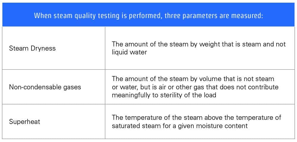 Steam Quality Testing The quality of the steam feeding an autoclave is an important factor in steam sterilization. Like temperature, pressure, and time – steam is a critical variable in the success and repeatability of the sterilization process. As such, steam quality should be part of the validation of any steam sterilizer. Steam quality is defined as the measurable physical aspects of steam used for sterilization. These physical aspects include temperature (superheat), dryness (liquid water content), and non-condensable gas content. (Steam quality is not a measure of the impurity content of the steam.) Deviations from established ranges of these aspects of the steam can result in the following issues: Wet loads Damaged loads Unsterile loads Sterilization (biological and chemical) indicator failures Staining and corrosion of instruments and containers Each of these issues has a specific cause or causes and can usually be remedied. What to Know About Steam Quality Almost every sterilizer manufacturer recommends “97% pure steam”. In general, this is not defined, rarely measured, and, if discussed at all, is relegated to the mythology of sterilizer arcana. The good news is that essentially all laboratory and medical autoclaves on the market today can provide sterile, dry, and intact sterilization loads if provided good quality steam from the steam supply. The bad news is that any autoclave can experience the above problems, and the cause is not always something that can be predicted. With careful design, following well-established principles, and proper maintenance, the system (steam supply and sterilizer) can be engineered to provide a large margin of security against steam quality noncompliance. For a production or GMP environment, steam quality testing should be part of annual preventative maintenance and qualification testing. Not sure what solution is right for you? Get Quote for Steam Quality